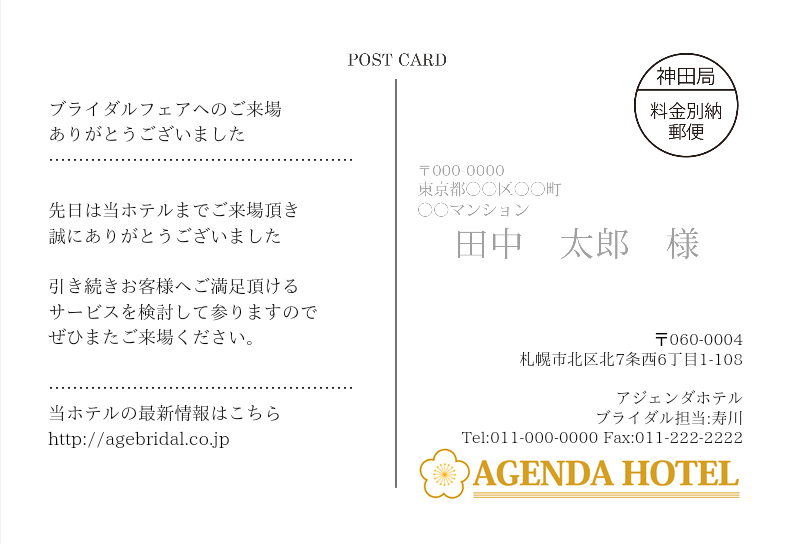 宛名面には、アプリからテキストを入力してメッセージを入れることができます。そして、個別のメッセージを添えて顧客一人ひとりとの距離を縮めたり、問い合わせ先やサイトアドレスを入れることで接点を作ったりと、コミュニケーションが可能です。