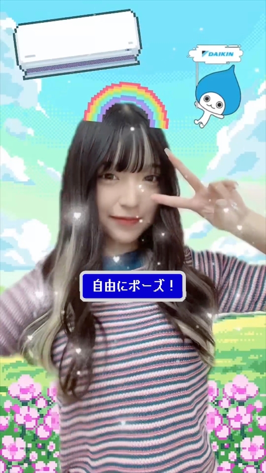 今回、当社が提供する「#ダイキンのエアコンを救え」エフェクトは、“夏のフル稼働で疲弊しきったエアコンを助ける”というミッションのもと、エアコンが冷房・除湿運転で取り除く「湿度」をユーザーが代わりにやっつけるというものです。不快なジメジメの原因となる「湿度」を「しずく」で表現し、音楽に合わせて落ちてくる「しずく」をパンチしてやっつける音ゲー風のエフェクトです。最後は、湿度を倒してエアコンが元気になった様子を虹とともに広がる爽やかな景色のエフェクトで表現。エアコンといえばダイキンというイメージの醸成をめざしたストーリーに仕上げています。