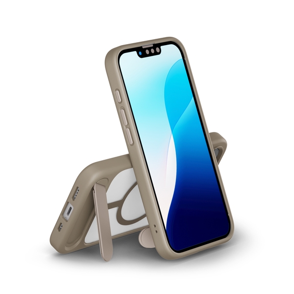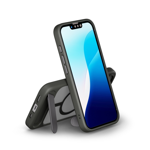 ケース背面に折りたたみ式スタンドバーを内蔵し、縦置き・横置きに対応しています。マグネットリング搭載でMagSafeアクセサリーをピタッと簡単装着。