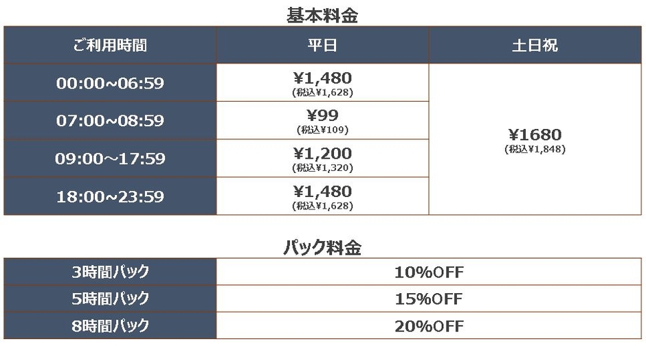 ・料金も1時間99円~と全店舗共通の格安価格。さらにサービス料や設備管理費などの追加費用なしで、わかりやすい料金体系となっています!