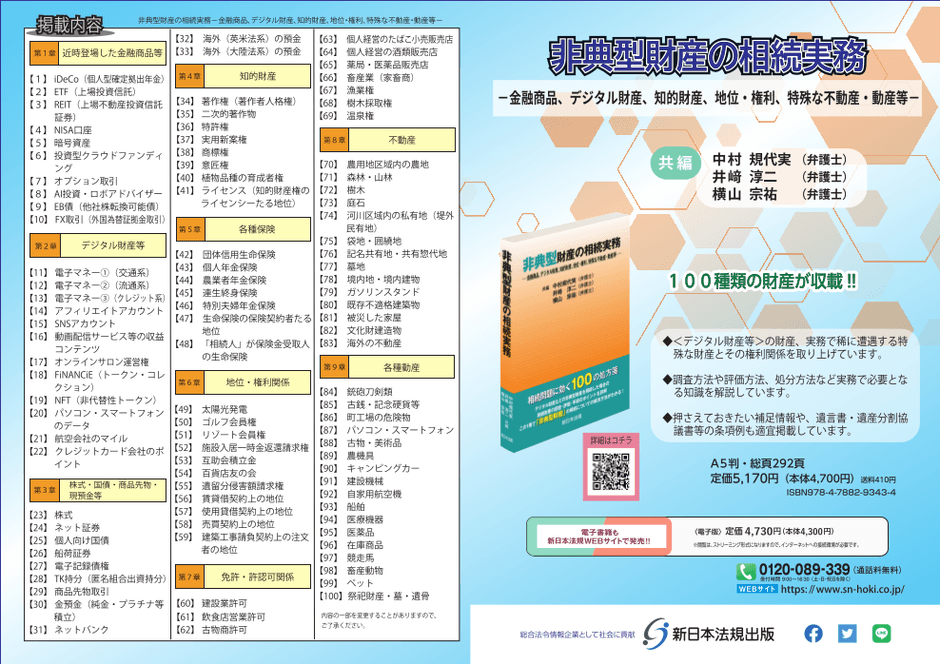100種類の財産が収載!!「非典型財産の相続実務-金融商品、デジタル財産、知的財産、地位・権利、特殊な不動産・動産等-」4/1新刊書発売!