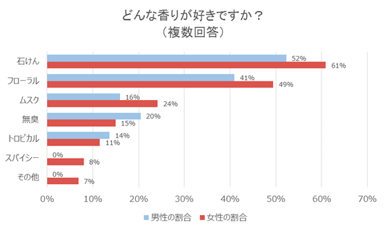 好きな香りについては、女性では1位「石けん」2位「フローラル」3位「ムスク」、男性では、1位「石けん」2位「フローラル」3位「無臭」という回答でした。女性は定番の香りの次に「ムスク」のような個性的なニオイを好み、男性は定番の香りの次に好むのは「無臭」という男女で差が出る結果になりました。