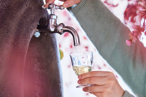 カフェの入口に、熱海梅園で多く咲く品種になぞらえた、高さ約2.8メートルの2本の梅の木の装飾が設えられます。それぞれの木の幹には蛇口が付いており、濃い紅梅色の花が特徴的な「八重寒紅(やえかんこう)」をイメージした木の蛇口から出てくるのは梅ジュースです。小さな子どもでも楽しめるよう、酸味がひかえめの優しい味わいです。今回新たに加わった、「呉服枝垂(くれはしだれ)」をイメージした木は、枝が広がり垂れているのが特徴的です。見上げると、まるで満開に咲き誇る梅に包まれているかのような気分を味わえます。この木の蛇口から出てくるのは梅酒です。口当たりが軽やかで、まろやかですっきりとした味わいに仕上げられた梅酒を堪能することができます。