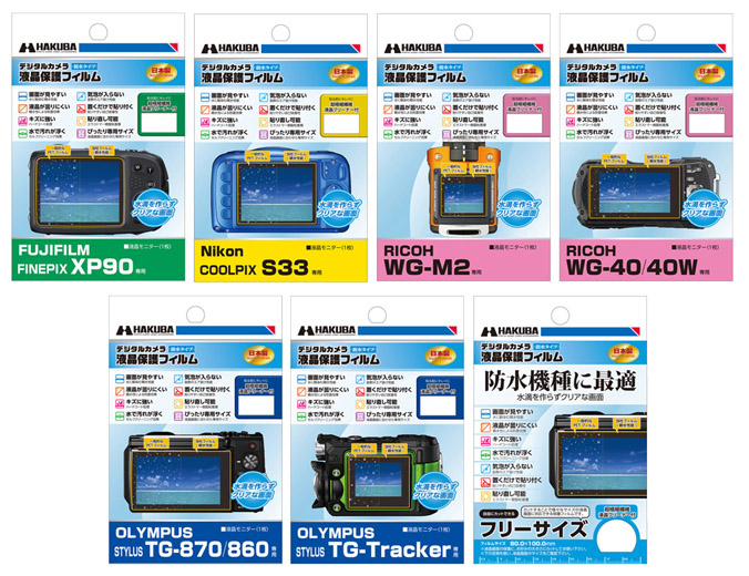 ハクバ写真産業株式会社 (本社:東京都墨田区)は、防水タイプのデジタルカメラに最適な親水タイプの液晶保護フィルム「FUJIFILM FINEPIX XP90」用、「Nikon COOLPIX S33」用、「RICOH WG-M2」用、「RICOH WG-40」用、「OLYMPUS STYLUS TG-870」用、「OLYMPUS STYLUS TG-TRACKER」用、「フリーサイズ(80×100)」用の7製品を追加いたします。