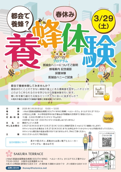 医療法人医誠会(本社:大阪市、代表者:谷 幸治)が運営する医療複合施設「i-Mall」内のヘルシーカフェさくらテラスは、春休み期間中の2025年3月29日(土)に都市で楽しめる「養蜂体験イベント」を開催します。親子での参加が可能で、ミツバチの巣観察、採蜜体験、医誠会ハニーの試食を通じて都市型養蜂や環境問題についての理解を深め、SDGsについて学ぶことが可能です。定員15組限定のこの特別イベントで、春休みの思い出を作りませんか?(主催:ホロニクスヘルスケア株式会社)
