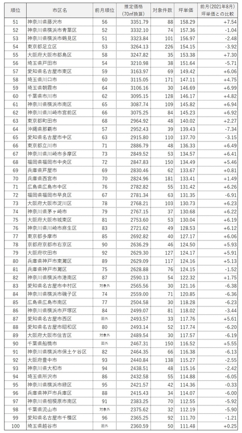 ・ランキング対象の182市区のうち、8月と比較して坪単価が上昇したのは102市区で、全体の約56%。