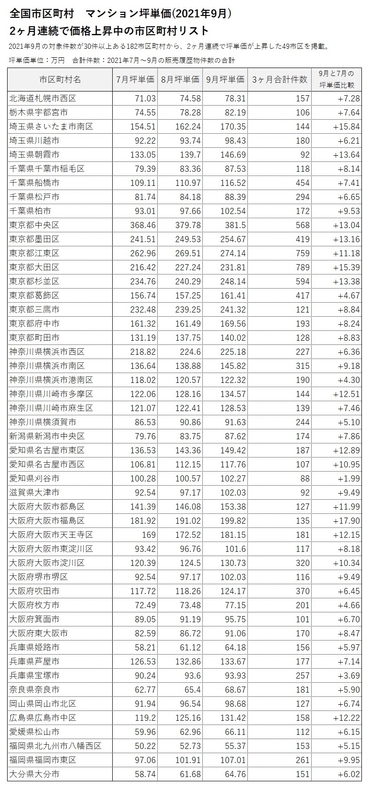 ・2021年7月から2ヶ月連続で坪単価が上昇したのは49市区、下落したのは18市区。