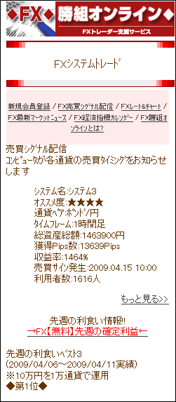 2009年4月20日 12:00株式会社オルタナレッジ(本社所在地:東京都渋谷区、代表取締役社長:岩崎 学、以下:オルタナレッジ)は、「EZweb」と「Yahoo!ケータイ」において、FXシステムトレード売買サイン配信サービス『◆FX◆勝組オンライン◆』の提供を開始しました。