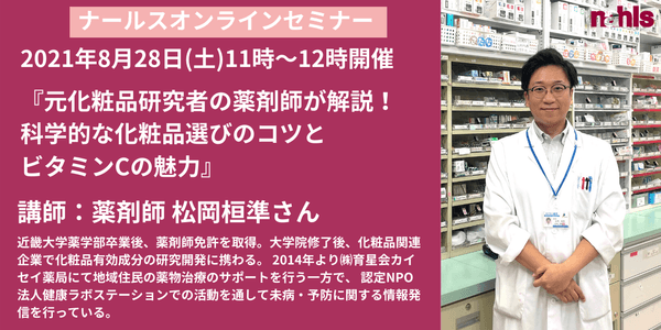 今回のセミナーでは、化粧品業界でビタミンCをテーマにした研究経験をもち、その後調剤薬局で年間数千人の皮膚科患者さんの対応をさせていただいた薬剤師から、お肌を健やかに美しく保つためのポイントと化粧品選びのヒントをお伝えします!
