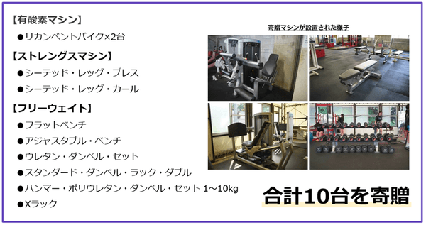 「今回のご寄贈により、より多くの部員が同時に器具を使用できるようになり、練習環境が一層充実いたしました。 これらの器具を最大限に活用し、日々の練習を重ね、競技力の向上に努めてまいります」