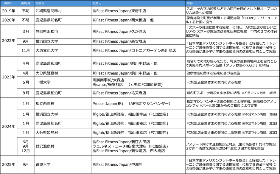 当社では、ESG活動の一環として、誰もがフィットネスにつながる機会の創出を目的に、エニタイムフィットネスのリニューアル時に発生する入替えマシンを、資金不足等の理由でトレーニング環境の整備に悩む、離島などの自治体や学校へ寄贈する活動を行っています。2021年には日本アメリカンフットボール協会と「トレーニング設備寄贈に関する連携協定」を締結し、横浜国立大学(2022年9月)や一橋大学(2023年6月)に寄贈を行ってまいりました。