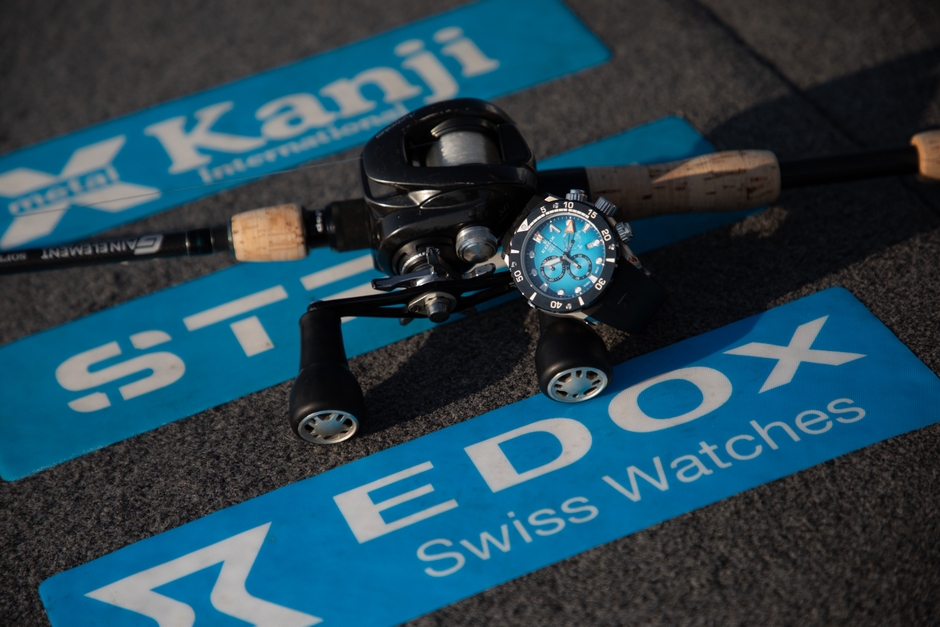 「試合中は水に強くて傷が付きづらいタフな腕時計を着けたいので、エドックスのプロスペックダイバーズウォッチは完全にマッチしています。私が着用しているモデルは、文字盤が愛用しているボートと全く同じ色だったので、一目惚れしました。大きくて重厚感のあるビジュアルですが、驚くほど軽く、釣りに最適だと感じています」