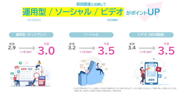 取引手法別でみると、運用型(ディスプレイ)・ソーシャル広告・ビデオ(WEB動画)については前回調査と比較してポイントが上昇する結果となった。