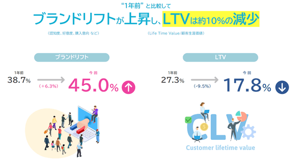 マーケティングやキャンペーンの成果・効果・分析・レポートで提供したい指標について、1年前の結果と比較すると、ブランドリフトが上昇、LTVが減少した。