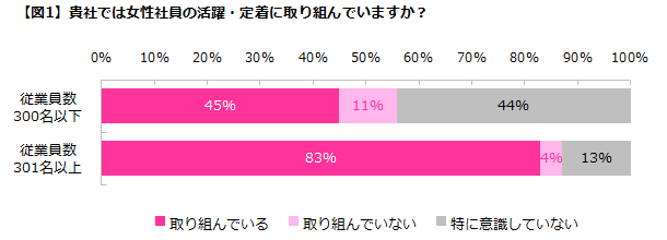 1:女性社員の活躍・定着に取り組んでいる企業は、従業員数301名以上で83%、300名以下は45%。具体的な取り組み内容は「福利厚生制度の充実」と「勤務形態の多様化」。
