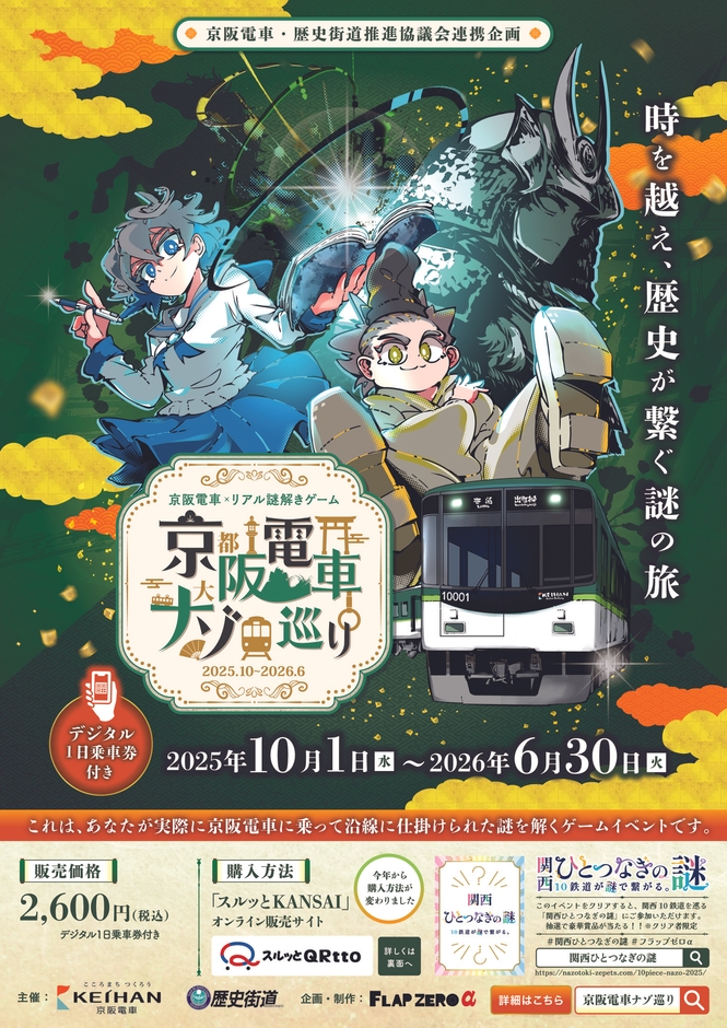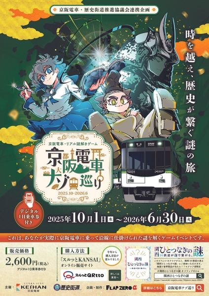 京阪電気鉄道株式会社(本社:大阪府枚方市、社長:井上欣也) と歴史街道推進協議会(会長:松本正義・関西経済連合会会長)は、歴史文化に触れ親しんでもらうとともに沿線の魅力発信を目的として、京阪沿線を活用したリアル謎解きゲームを2025年10月1日より開催いたします。