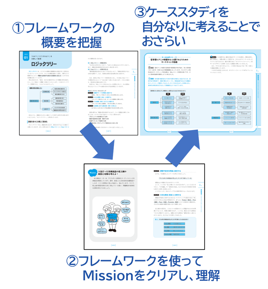 本書では、厳選した20のフレームワークを仕事の流れに沿った7つのプロセスに分け3段構成で解説。
