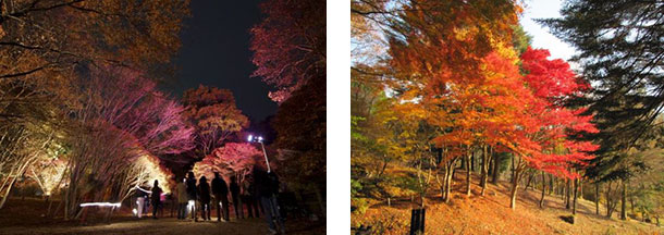 左:紅葉ライトアップ(イメージ) 右:園内の紅葉紅葉は山から降りてくるといわれ、標高の高い六甲山では京都などの市街地よりも、約1ヶ月早く木々が色づきます。当園では、様々な種類の紅葉を見ることができ、例年は10月中旬から11月中旬にかけて変化する木々の彩りをお楽しみいただけます。