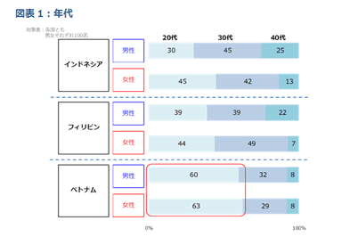 インドネシア、フィリピンは20代と30代の割合がそれぞれ3-4割を占めた。両国の男性は、40代の割合が2割以上と女性40代と比較するとやや高かった。ベトナムは、インドネシア、フィリピンと比較すると男女とも20代の割合が6割と高かった。