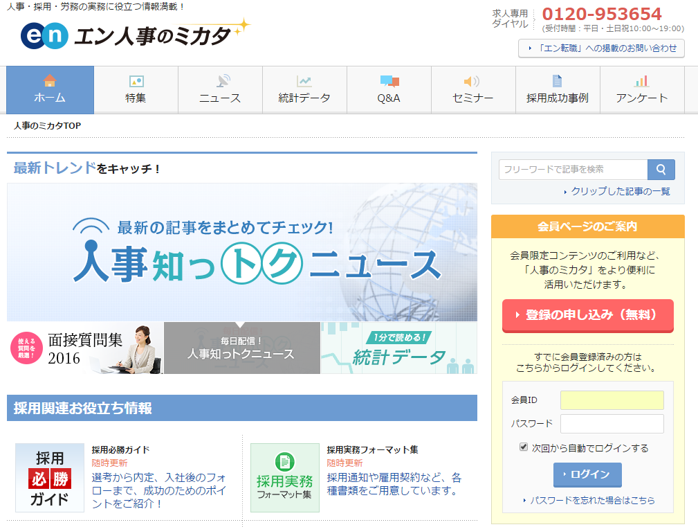 2002年10月に「他社の採用方法を知りたい」「求人動向が知りたい」といった人事の方の声にお応えしてスタートした無料の会員制サービスです。業界最大級の約7万5千人(2016年7月時点)の会員が利用。調査データや最新の求人動向、採用成功事例、人事労務関連の情報を提供しています。