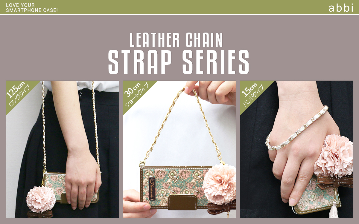abbiブランドの核である『女性らしさ』を象徴する、金属のチェーンにPUレザーを通した女性らしいアクセサリー感覚のストラップです。
