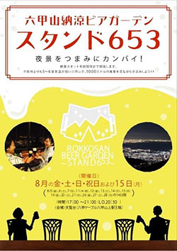 2016年8月1日 16:15阪神電気鉄道株式会社(本社:大阪市 社長:藤原崇起)のグループ会社である六甲山観光株式会社(本社:神戸市 社長:宮西幸治)は、8月の金・土・日・祝日および8月15日(月)に、神戸山手大学と共同で「六甲山 納涼ビアガーデン“スタンド653”」を運営します。