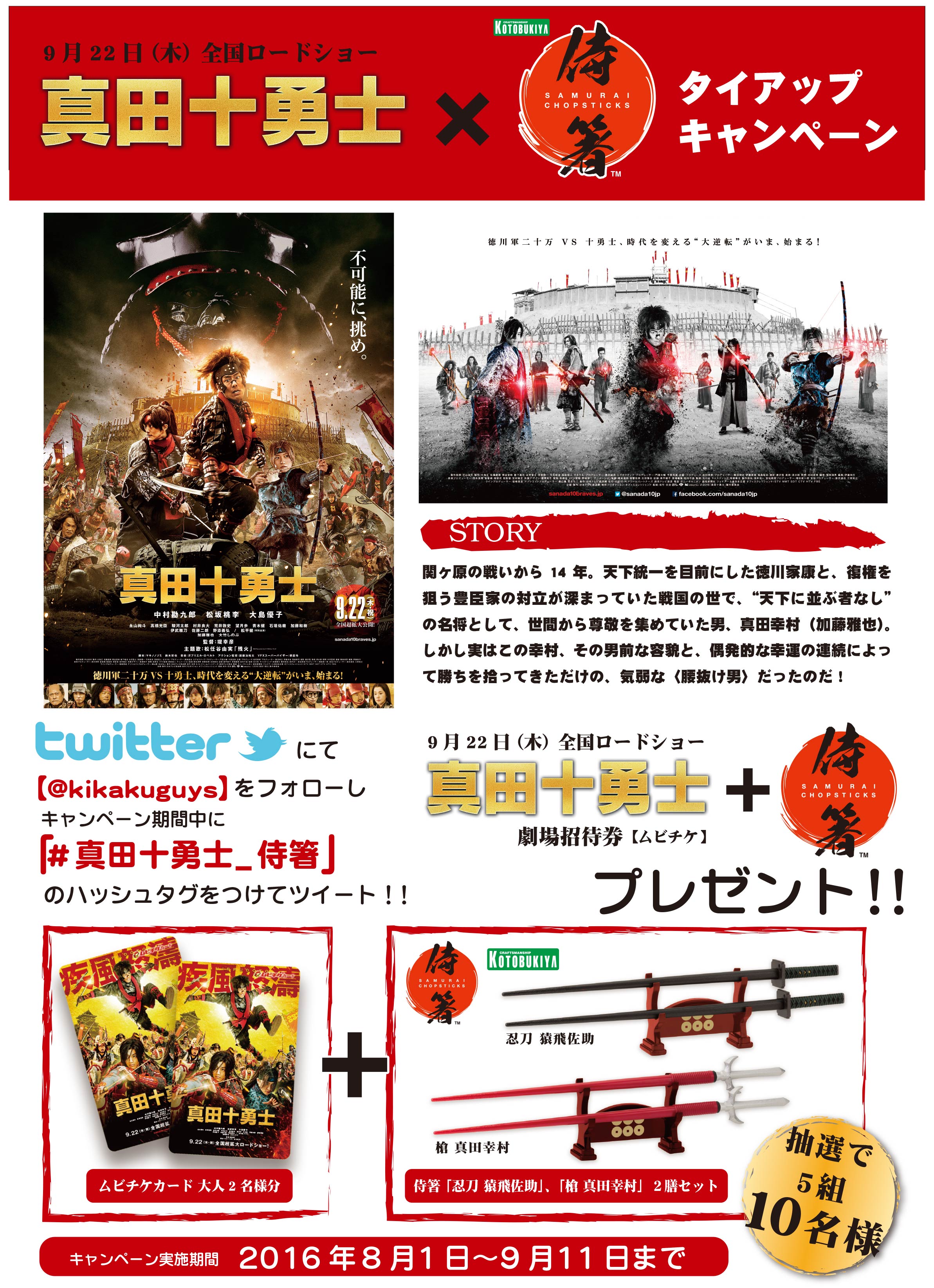 ご当選者様には、『真田十勇士』の劇場招待券(ムビチケカード)2名様分と、侍箸「槍 真田幸村」、「忍刀 猿飛佐助」2膳セットを、それぞれ5組10名様にプレゼントします。