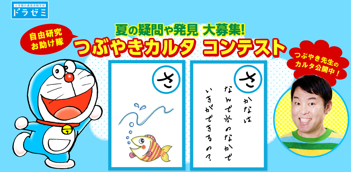2016年8月8日 14:00通信添削学習サービスの「ドラゼミ」を運営する株式会社小学館集英社プロダクション(本社:東京都千代田区、代表取締役社長:都築 伸一郎)は、2016年8月5日(金)に、つぶやきシローさんとコラボレーションした「つぶやきカルタ コンテスト」ページをオープンしました。また夏休み中の「疑問や発見」をカルタで応募するコンテストも開催いたします。