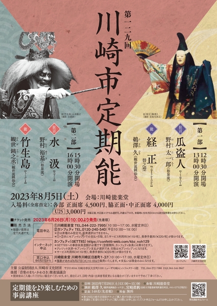 公益財団法人川崎市文化財団主催、『第129回川崎市定期能』が2023年8月5日 (土)に川崎能楽堂(神奈川県川崎市川崎区日進町1-37)にて上演されます。
