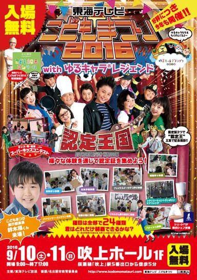 当日は朝9時より、こどもたちの好きな遊びや憧れの本格職業体験ができる、24種類を超えるブース「認定王国」の設置や、スーパーキッズたちによる、歌・ダンス・演奏の披露を行うほか、11日の午後には2016年ゆるキャラ(R)グランプリの中間発表会を実施。また、こどもまつり実行委員長の鈴木福くんが来場し、両日を盛り上げます。