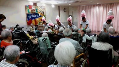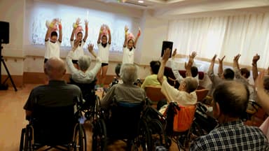 また、歌や演奏、パフォーマンスを一方的に“披露”するだけでなく、施設の利用者や入居者が一緒に“参加”することで、アンチエイジング効果を得ることも目的です。そのため、一緒になって楽しめるような単純なパフォーマンス(たまごのキャッチボール、マシュマロを投げて口でキャッチする)や、簡単な手品などをミニライブのなかに取り入れ、ひやひやドキドキの感情を引き出す努力もしています。これらも子供達が目の前でやっているからこそ、高齢者に自分のことのように楽しんでいただけます。