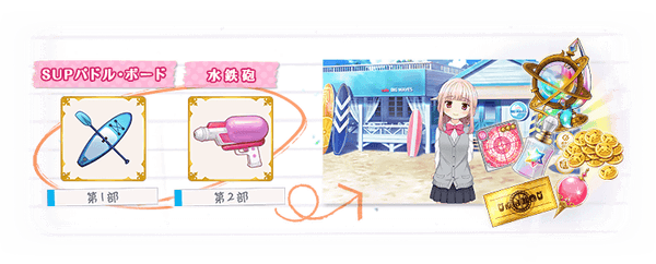 APを消費し、本イベントのクエストをプレイすることでイベント限定ショップで交換に使えるアイテム「SUPパドル・ボード」「水鉄砲」や特定のクエストを解放できるフラグメントを獲得できます。
