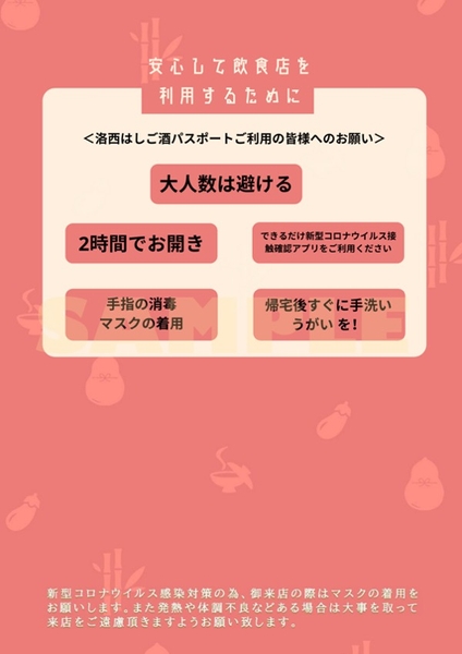 洛西はしご酒パスポート裏面に、飲食店に伺う際の感染症対策やお開きの基準、人数の制限などを記載し、パスポートを確認することでお客様自身にご配慮頂くようにお願いしています。