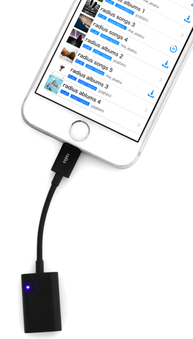 「mora」からダウンロードした曲はラディウスのLightning接続の外部ストレージ(AL-LCS11/12)にも保存することができます。外部ストレージに音楽を保存しておけばiPhoneの容量を気にすることなく、沢山の音楽を持ち歩くことができます。64GB接続時にはハイレゾ音源なら約400曲、圧縮音楽データなら約8,000曲を保存することができます。