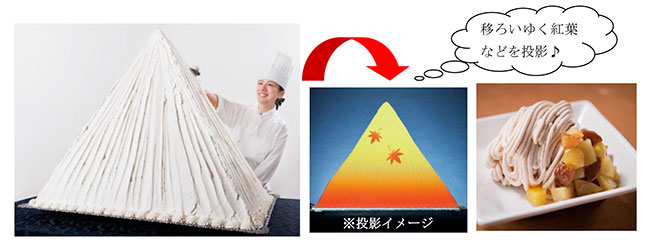 【特徴】高さ約77cm、横幅約94cmの「びっ栗モンブラン」。その大きさもさることながら真っ白なクリームをスクリーンに見立て、秋をイメージした楽しい映像を投影します。