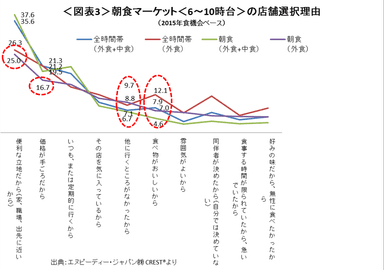 店舗選択理由を見てみると(図表3)、朝食の外食については「便利な立地だから」「価格が手ごろだから」が比較的少ないです。他の店舗選択理由に比べて高スコアではありますが、他の時間帯や中食と比べると重要性は低いようです。面白いことに「食べ物がおいしいから」は7.0%で、外食全体の12.1%に比べ5ポイントも低いことが分かります。「他に行くところがなかったから」という消極的な理由が「食べ物がおいしいから」より高いスコアで他軸よりも高いことから、朝食を外食したいけれども魅力的なお店やお気に入りの店、美味しい店がない、という“朝食難民”も多数いることが分かります。