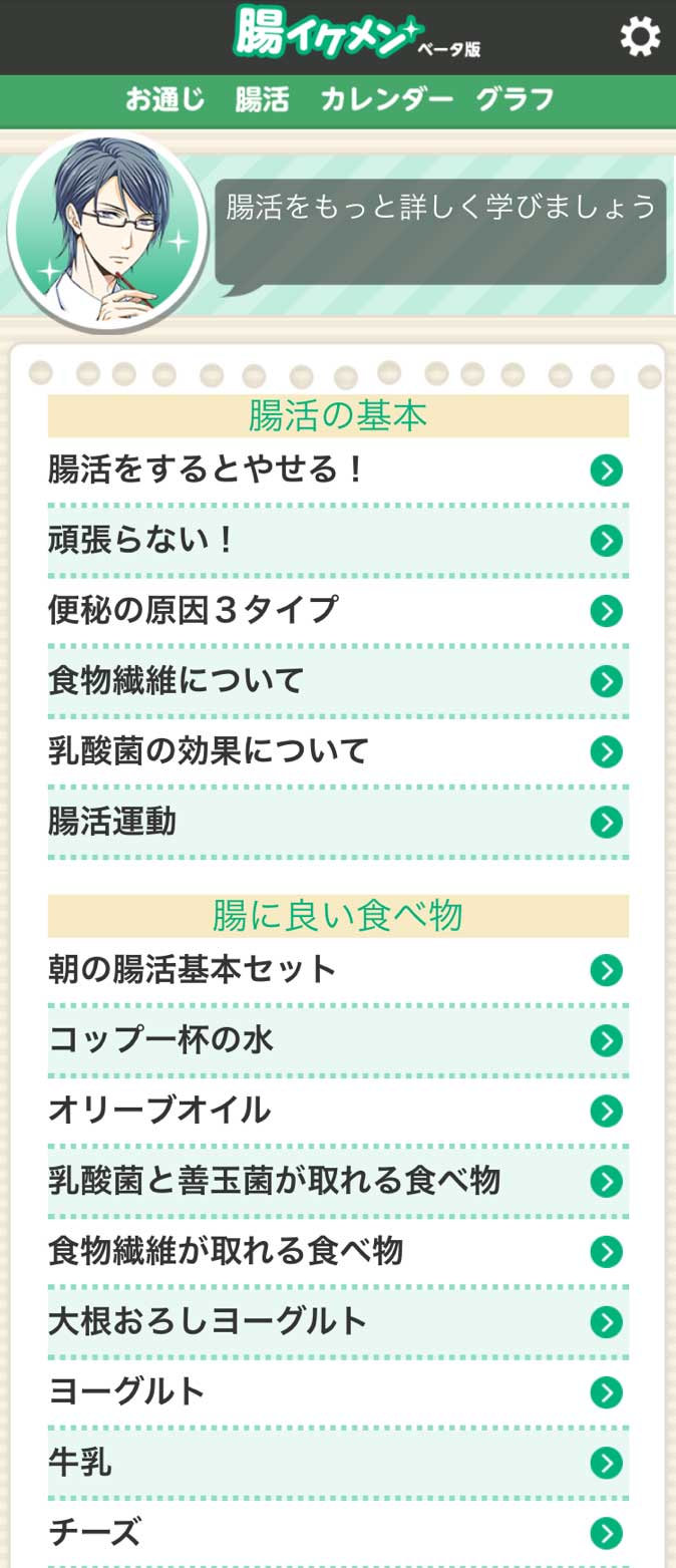 また、腸活の参加度合いに合わせて、キャラクターの表情が変化し、それに合わせた台詞が表示されることで、ゲーム感覚で楽しく続けることができます。