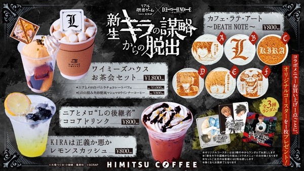 株式会社SCRAP(本社:東京都渋谷区、代表:加藤隆生)は、人気漫画「DEATH NOTE」とコラボレーションした新作リアル脱出ゲーム『新生キラの謀略からの脱出』のオリジナルメニュー情報を発表いたします。【特設サイト:https://realdgame.jp/s/death-note/】