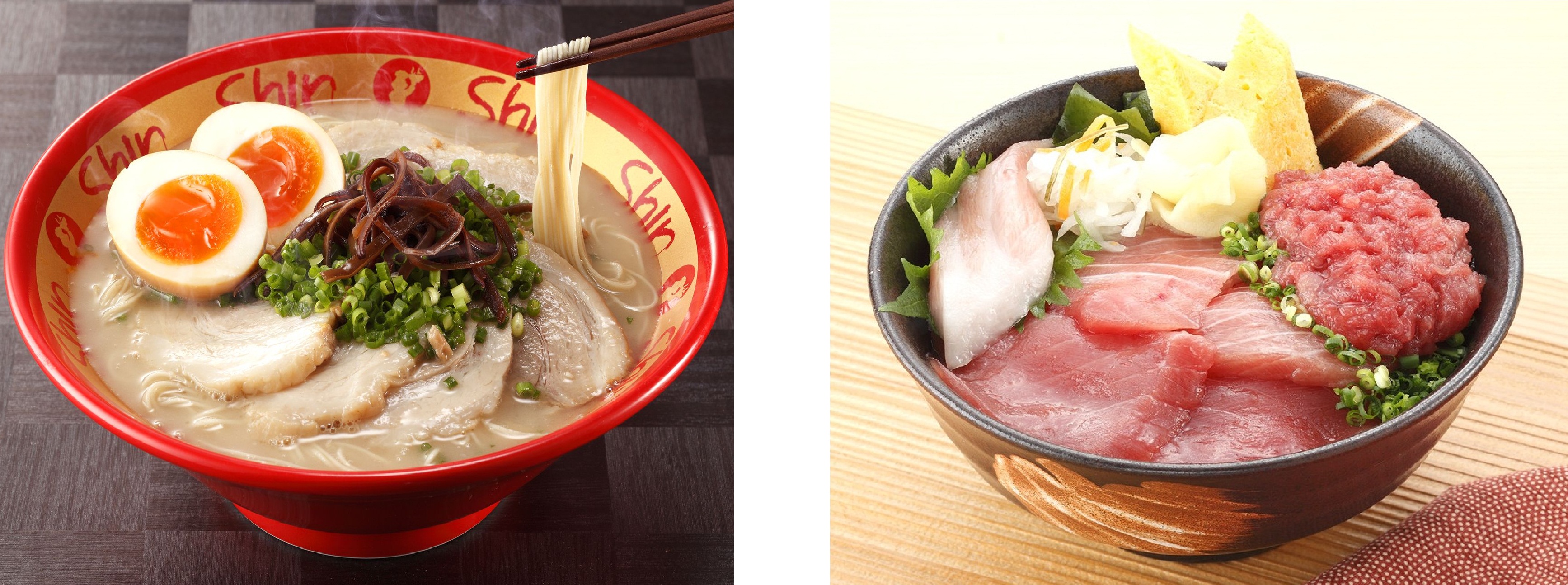 左『博多らーめん Shin Shin』、右『黒まぐろ専門店 黒・紋』<本場博多のとんこつラーメンや豪快なクロマグロ丼をイートインコーナーで展開!>