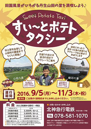 2016年8月25日 17:15北神・北摂地域の公共交通機関等6社(神戸電鉄、北神急行電鉄、神鉄バス、神鉄タクシー、神鉄観光、神鉄エンタープライズ)で構成する「北神・神鉄連携活性化協議会(事務局:北神急行電鉄、 以下:協議会)」と、JA兵庫六甲山田支店、みのたにグリーンスポーツホテル「銀河の湯」では、谷上駅から「丹生山田の里」のさつま芋農園までを結ぶ観光タクシー「すい~とポテトタクシー」を運行いたします。