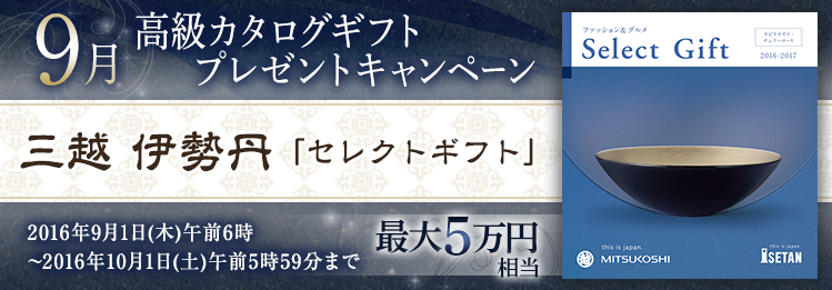 9月は、ファッション雑貨、食品や家電などの多彩なジャンルからお選びいただける、国内最大手百貨店・三越伊勢丹のカタログギフト『セレクトギフト』をプレゼントします。