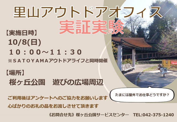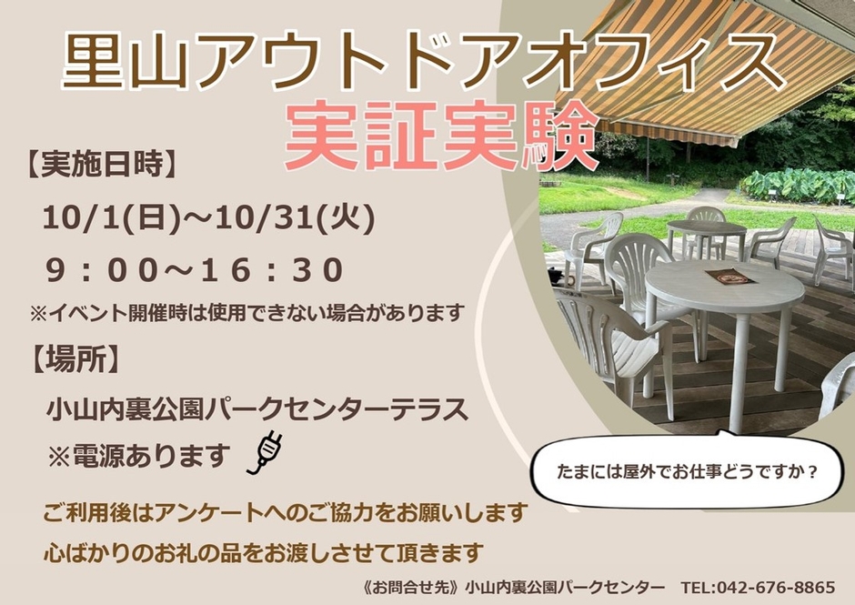 小山内裏公園と桜ヶ丘公園では、10月の対象期間中、ワーケーションやテレワークをされている方向けに、テーブルを用意して屋外オフィス「里山アウトドアオフィス」をお試しいただく実証実験を行います。