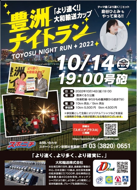 人気のランニングスポット・東京都江東区の豊洲エリアを舞台に、10月14日(金)午後7時からスポニチ主催「より速く!大和輸送カップ豊洲ナイトラン」を、別表の概要で開催します。ゲストには、市民ランナー応援ソング「より速く!」がヒット中の島谷ひとみが登場します。