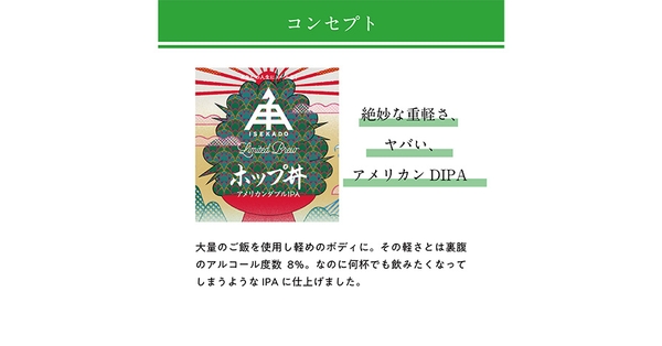事業内容:伊勢神宮近くに本社・醸造所を構え、「あなたの人生にエールを!」をスローガンに掲げるクラフトビールブランド。創業当時から、無謀だと言われることや誰も挑戦していないことに積極的に取り組んで参りました。その結果、国内外の品評会で数多く受賞し、ビール界のオスカー賞と言われる最も歴史ある英国IBAで2017年・2019年・2021年と日本勢初となる3大会連続でゴールドメダルを受賞致しました。10種の定番商品をはじめとし、様々な種類のビールの製造を展開。豊かなビール文化を協創すべく世界基準で”本物”のビールをお届けしています。