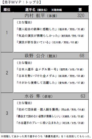 MVP=視聴してよかった選手のうち「最優秀選手」と回答された数。(男女各1名ずつ)