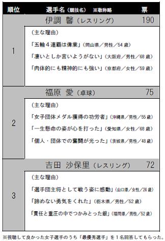2位は、卓球女子団体主将としてチームを牽引した福原愛選手、3位は日本人選手団主将の重責を務め、4連覇の重圧がかかる中で銀メダルを獲得した吉田沙保里選手となりました。