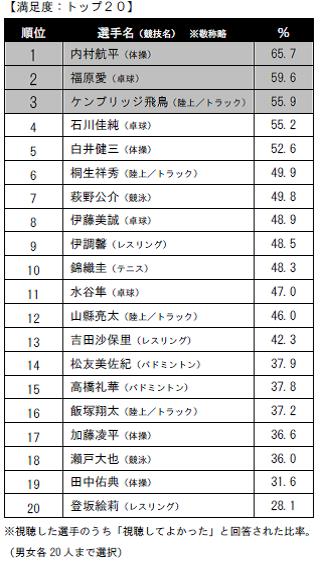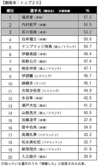 観戦率1位は福原愛選手でした。4大会連続の出場となった今大会は卓球女子団体の主将を務め、ロンドン五輪に続く団体メダル獲得に貢献しました。3位には石川佳純選手(卓球)、6位に伊藤美誠選手(卓球)が入り、卓球女子3選手がいずれもトップ10に入りました。2位は内村航平選手(体操)で、4位にも体操の白井健三選手が入りました。