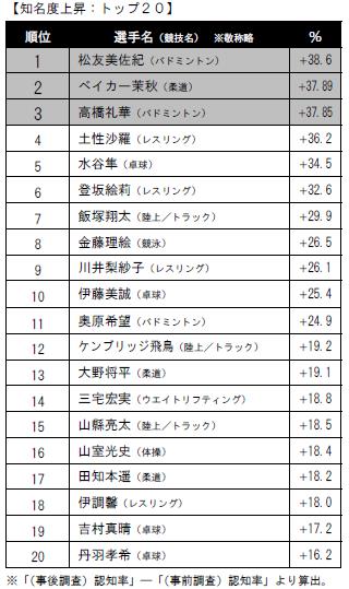 最も知名度が上がった選手は、バドミントンの松友美佐紀選手となりました。ダブルスを組んだ高橋礼華選手も3位に入り、金メダルを獲得した“タカマツ”ペアの知名度が急上昇しました。2位は五輪初出場で金メダルを獲得したベイカー茉秋選手(柔道)でした。