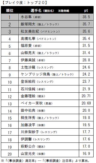 ブレイク度1位は、卓球の水谷隼選手でした。開幕前の調査では9%程度の注目率にとどまっていましたが、視聴した方の多くが満足し、知名度も大幅に上昇(五輪前:28位→五輪後:5位)しています。