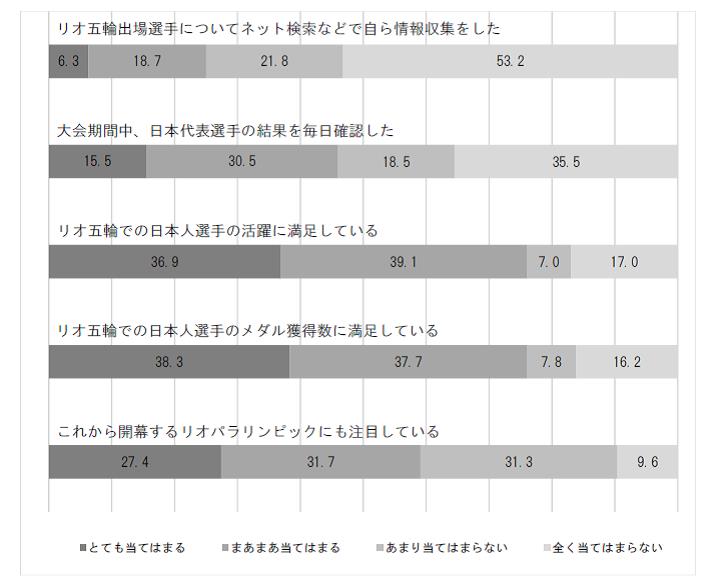 リオ五輪で日本は、金メダル12個・銀メダル8個・銅メダル21個と計41個のメダルを獲得して、過去最多のメダル数となりました。メダル獲得数について、回答者の76%(「とても当てはまる」38.3%+「まあまあ当てはまる」37.7%)が“満足している”と回答しました。